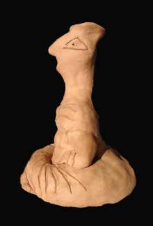 Schlangengöttin Figurine: Tonstatuette aus Kreta ca. 8000 Jahre alt. Halb schlangen-, halb menschenähnliche Skulpturen in hockender Stellung erscheinen auf Kreta und den ägäischen Inseln seit dem Neolithikum bis in die Bronzezeit. Sie ist in der Yogahaltung dargestellt, mit schlangenartigen Beinen. Die Schlangengöttin trägt seit dem 7. Jahrtausend immer eine Art Krone. Die Krone gilt als Symbol für Klugheit und Reichtum. Die Schlange war das Symbol für Lebens- und Schöpfungskraft. Sie war etwas Urtümliches und Geheimnisvolles, das aus den Tiefen des Wassers kam, wo das Leben beginnt. Durch das Abstreifen der alten Haut erneuert sich die Schlange periodisch. Durch ihren Winterschlaf hält sie die Verbindung mit der Unterwelt. Das alles machte sie zu einem Symbol für die Kontinuität des Lebens. In ihr ist eine machtvolle Kraft konzentriert, die über ihre eigenen Grenzen hinaus ausstrahlt und die umgebene Welt zu verändern vermag. Das Schlangenmotiv entwickelte sich in der Keramik zur charakteristischen Spiralornamentik. Die Schlange war die prähistorische Hüterin der Quellen des